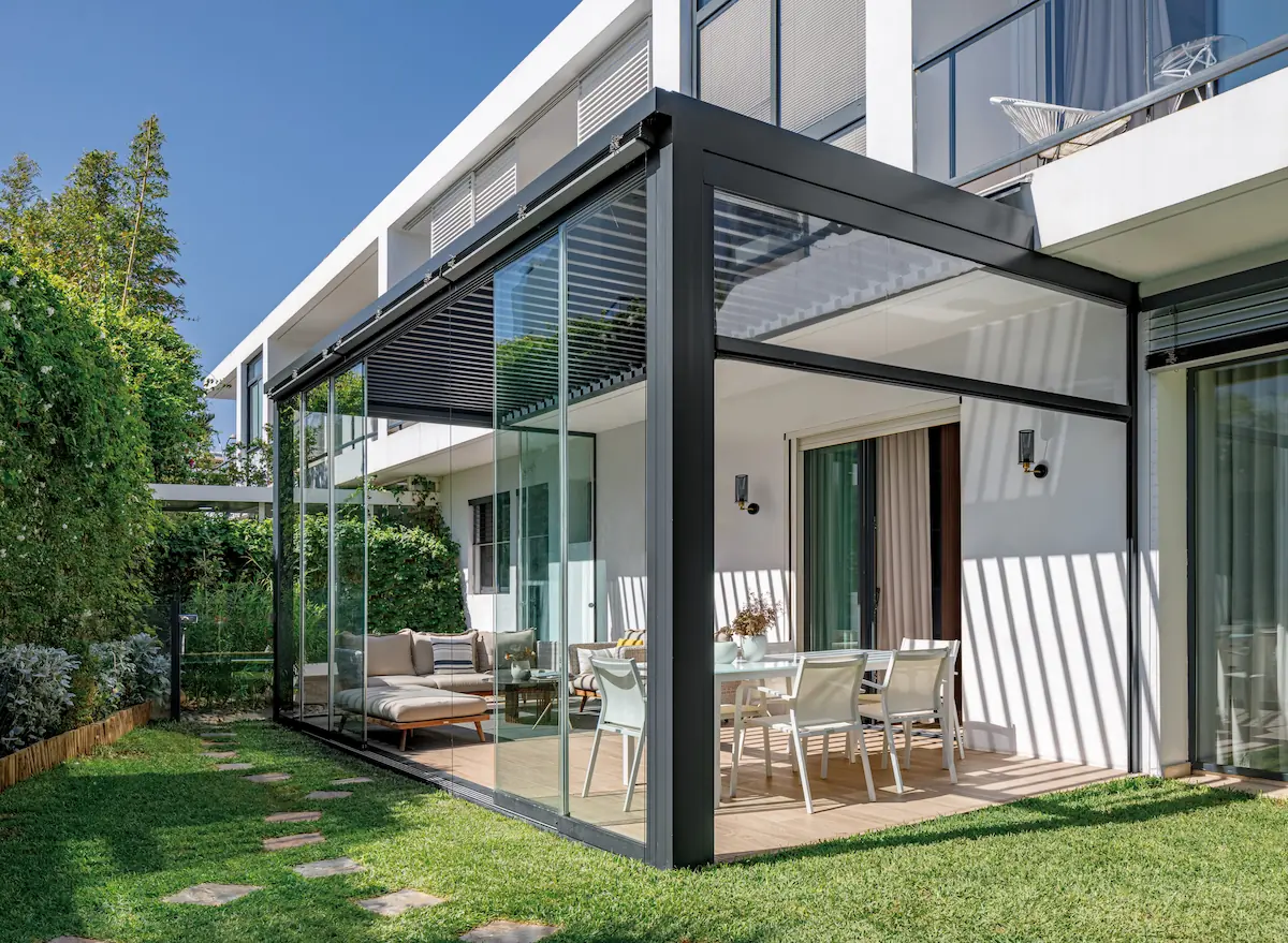 Le système de lames orientables motorisées de sa toiture régule naturellement la luminosité et la température, offrant un espace de vie extérieur agréable en toute saison.